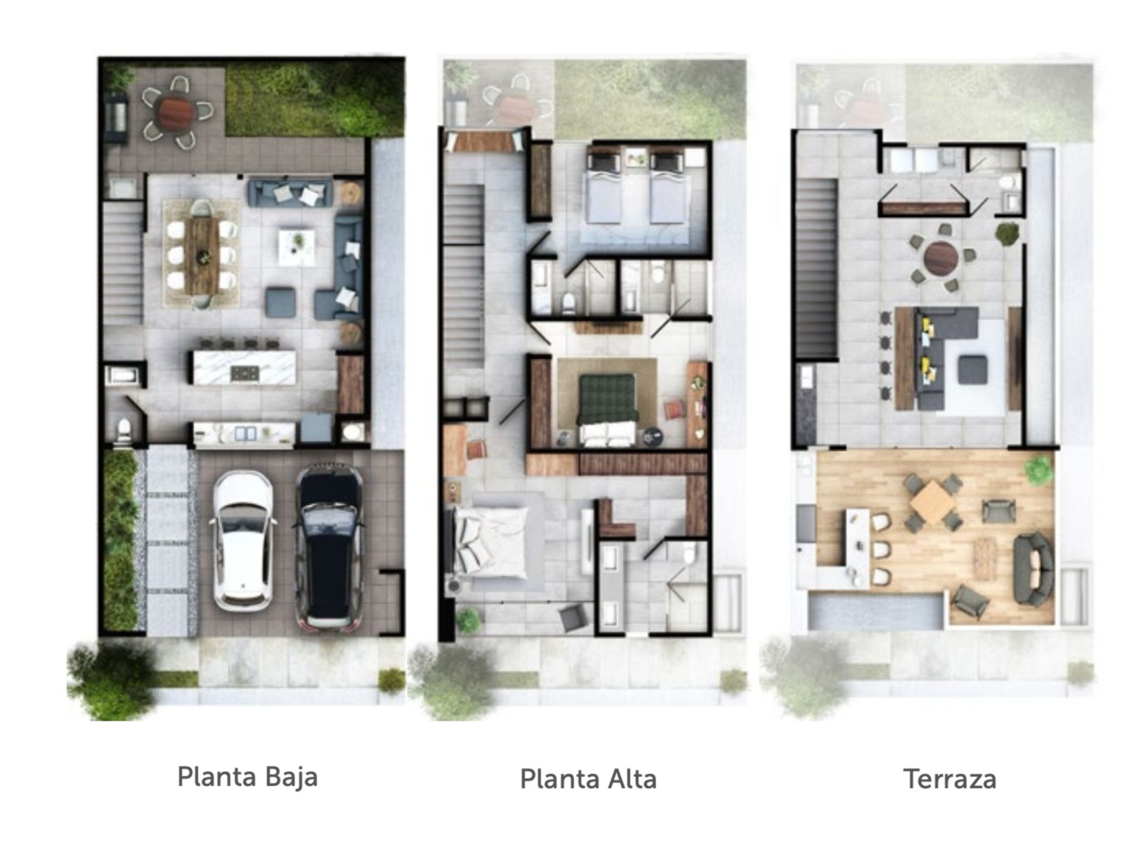 En planta baja cuenta con sala, comedor, cocina, lavandería, ½ baño, jardín con terraza y cochera doble.